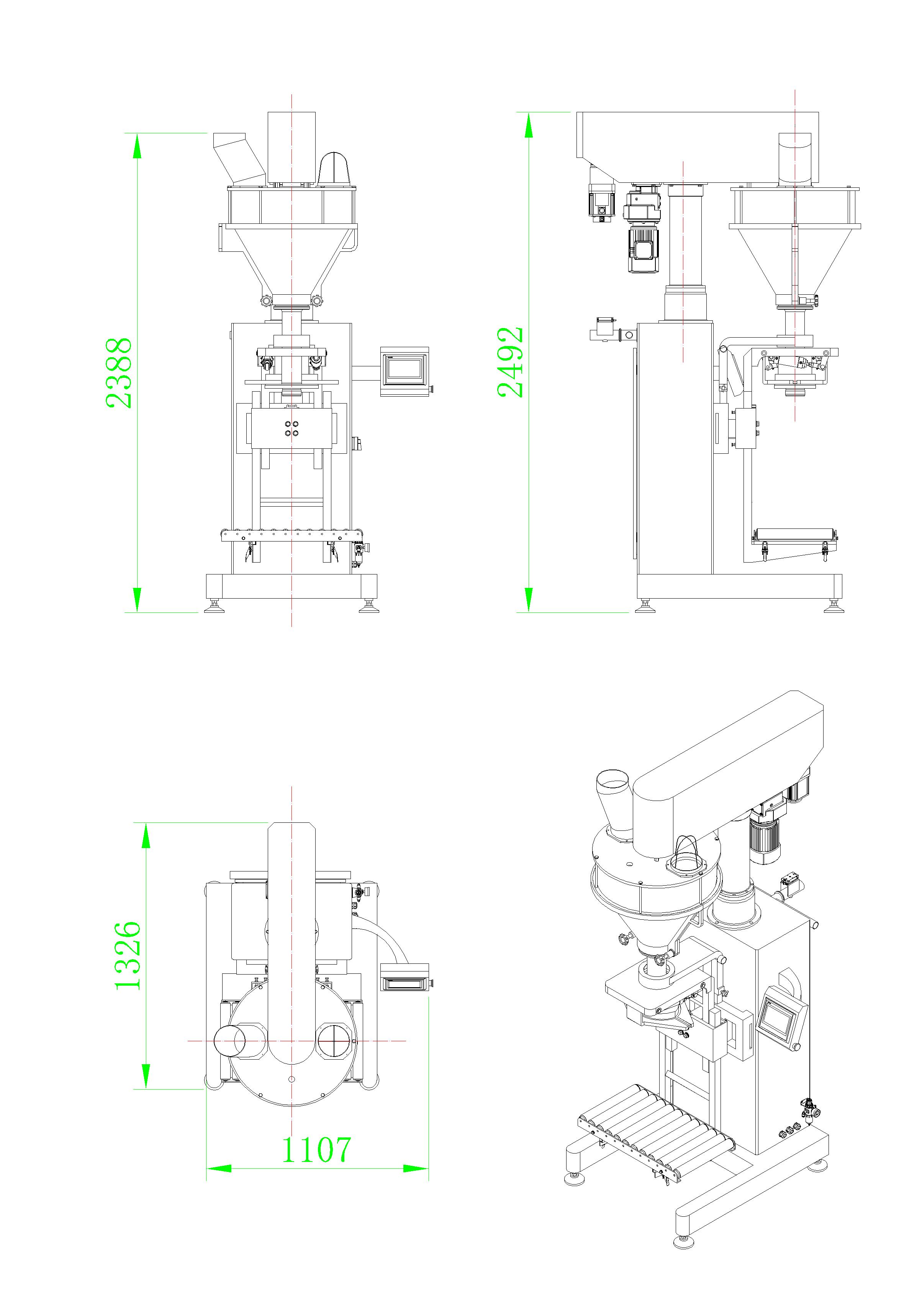 該機主要針對容易揚塵的超細粉末及高精度的包裝要求而開發(fā)設計,根據裝在容器下面的重量傳感器給出的信號完成雙速充填、計量及等工作,